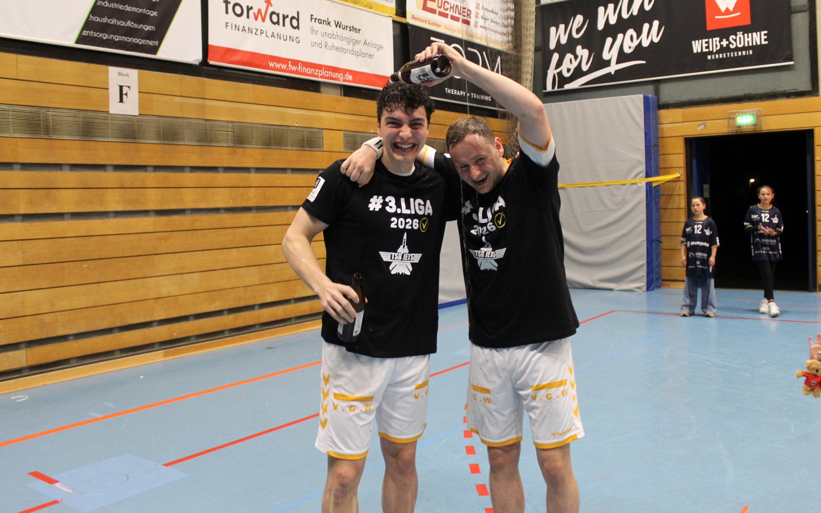 Als Andreas Maier den letzten Ball abblockte und die Zeit herunterlief, da sank Mitspieler Kai Schäffner erschöpft auf die Knie und wurde vom Wolfgang Bächle beinahe erdrückt. Im nächsten Momente stürmten die Jugendspieler des TSB Gmünd, die 60 Minuten lang an den Trommeln den Takt vorgegeben hatten, dazu. Wenig später verpasste sich das Kapitänsduo Bächle und Tom Abt gegenseitig die erste Bierdusche. Die Hofbühlhalle in Neuhausen wurde zum Startpunkt für eine zuvor nie dagewesene Party. Der 18. April 2026 ist ein Tag für die Geschichtsbücher des TSB Gmünd gewesen.