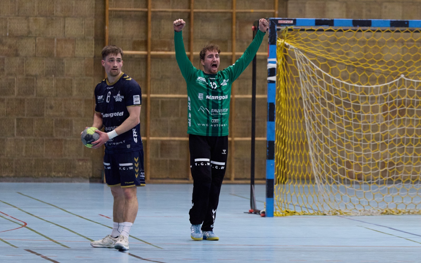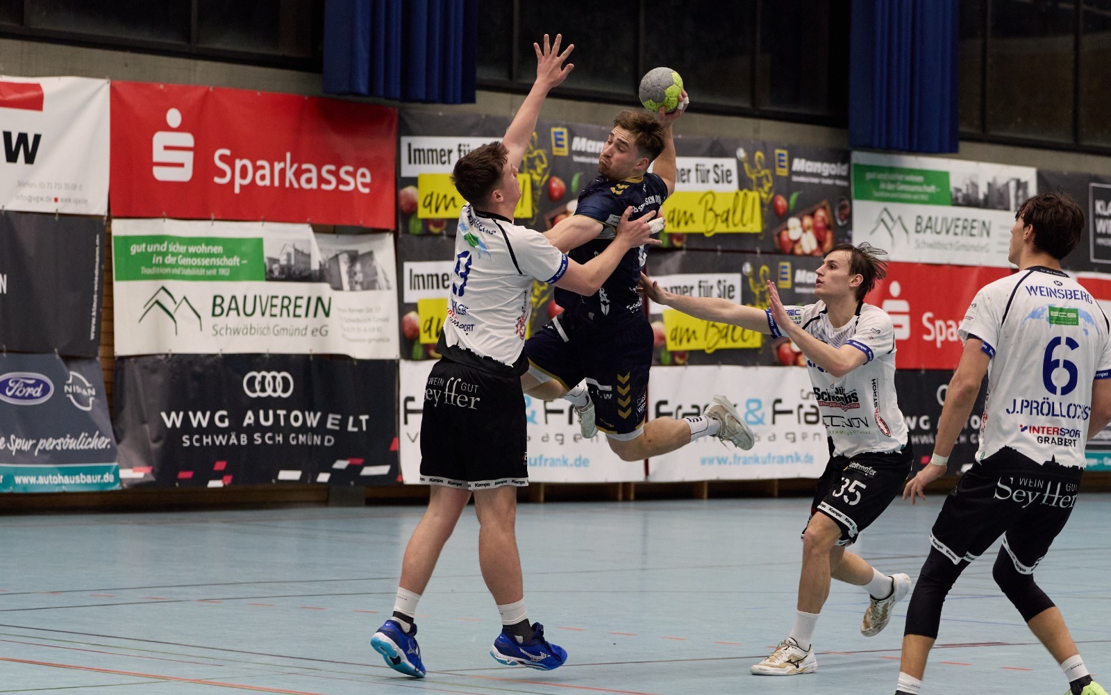 Tatsächlich bot das Team seinen 600 Zuschauern eine beeindruckende Vorstellung, vermutlich sogar die kompletteste Leistung in dieser Saison. Zum neunten Mal in Folge erzielte der TSB über 30 Tore, Daniel Mühleisen war mit jeweils sieben Paraden in beiden Halbzeiten ein hervorragender Rückhalt und vor allem war die Abwehr von der ersten Sekunde an hellwach. Was auch nötig war gegen die jungen Weinsberger, die vorige Woche 48 Treffer gegen Plochingen erzielt hatten. Gleich in der ersten Aktion packten die TSB-Abwehrstrategen Patrick Watzl und Andreas Maier kräftig zu und feierten sich gegenseitig ab. In den ersten fünf Minuten kassierte der TSB keinen Gegentreffer und legte ein 2:0 vor, weil Mühleisen den Gästen gleich einmal zwei freie Würfe abkaufte.