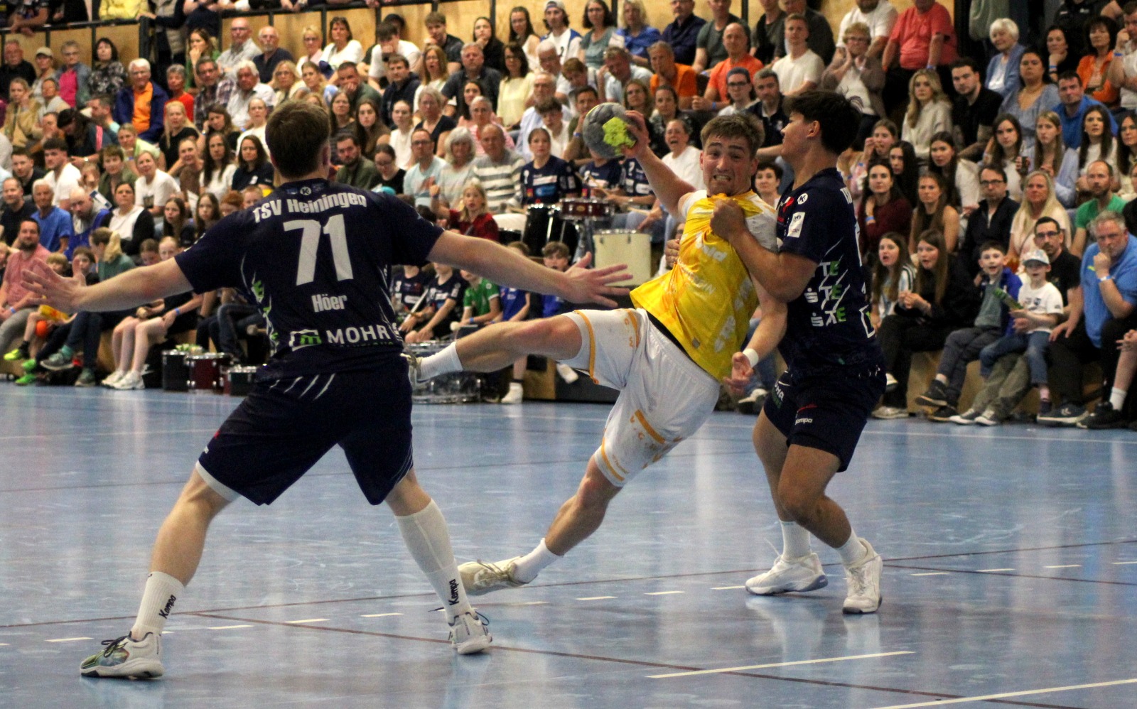Nichtsdestotrotz war es ein prickelndes Derby, in dem keiner der 650 Zuschauer sein Kommen bereuen und auch der Meister sich keinen Vorwurf in puncto Einsatz gefallen lassen musste. Gleich zu Beginn setzte sich Kai Schäffner energisch durch und erzielte die ersten beiden Tore. Die Heininger glichen aber schnell aus, denn sie hatten die richtigen Lehren aus der 24:37-Hinspielschlappe gezogen. „Damals hatten wir keine Lösungen gegen die vier Rückraumspieler und das entsprechend aufgearbeitet“, erklärte TSV-Trainer Hagen Gunzenhauser: „Der andere Part war, dass wir uns gegen die starken Gmünder Abwehr nur einen kurzen Wackler geleistet und es sonst sehr fokussiert heruntergespielt haben.“