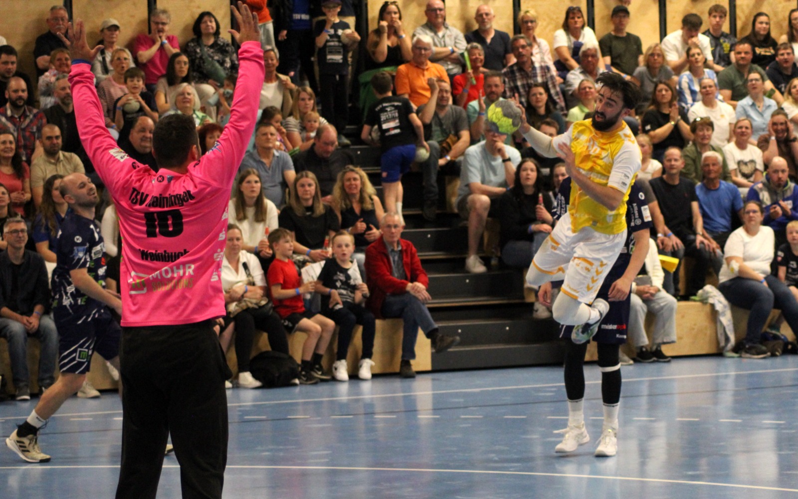 Die Jets ließen es keinesfalls locker angehen, sie hatten richtig Lust darauf, vor der tollen Kulisse befreit aufzuspielen. Torjäger Niklas Burtsche vergab seinen ersten Wurf, machte es kurz darauf aber und traf zur 6:3-Führung (9.). Es ging hart und hektisch zur Sache, obwohl es nur noch für die Hausherren um etwas ging. Die Überzahlsituationen nutzte der TSB zunächst gnadenlos aus. Nach einem kollektiven Ballgewinn stürmte Stefan Scholz davon und verwandelte lässig ins leere Tor, Yannik Leichs erhöhte sogar auf 10:6 (17.). „Solange wir in unserer normalen Formation gespielt haben“, meinte Fröhlich, „hat man gesehen, dass wir aktuell einfach besser sein. Auch wenn vielleicht der allerletzte Biss gefehlt hat.“