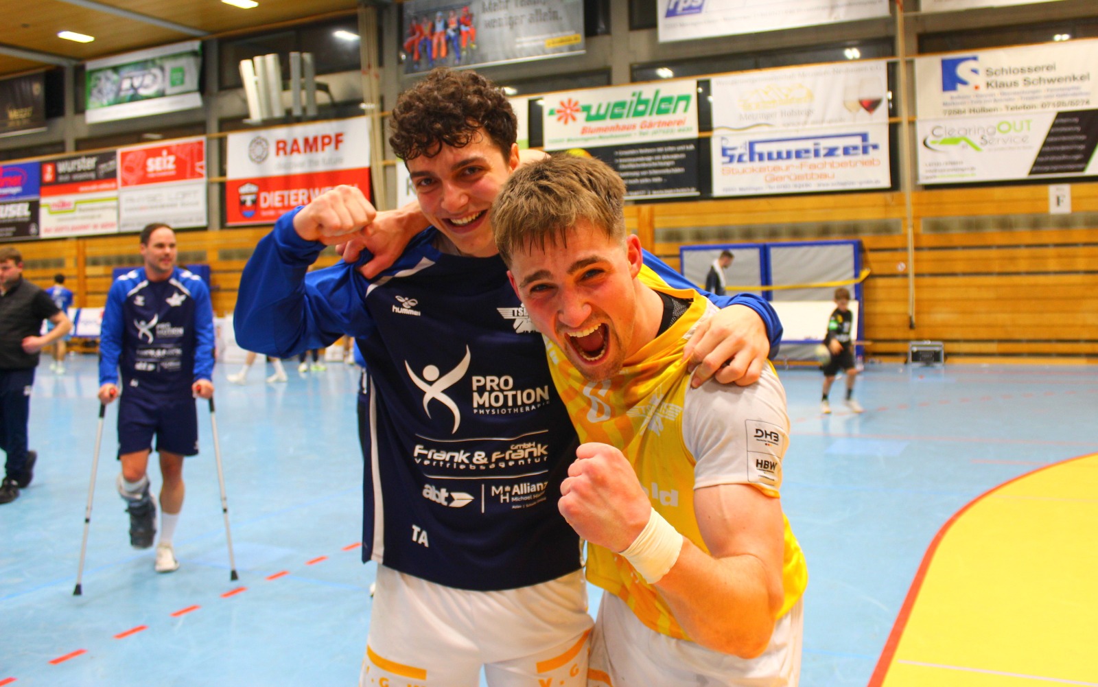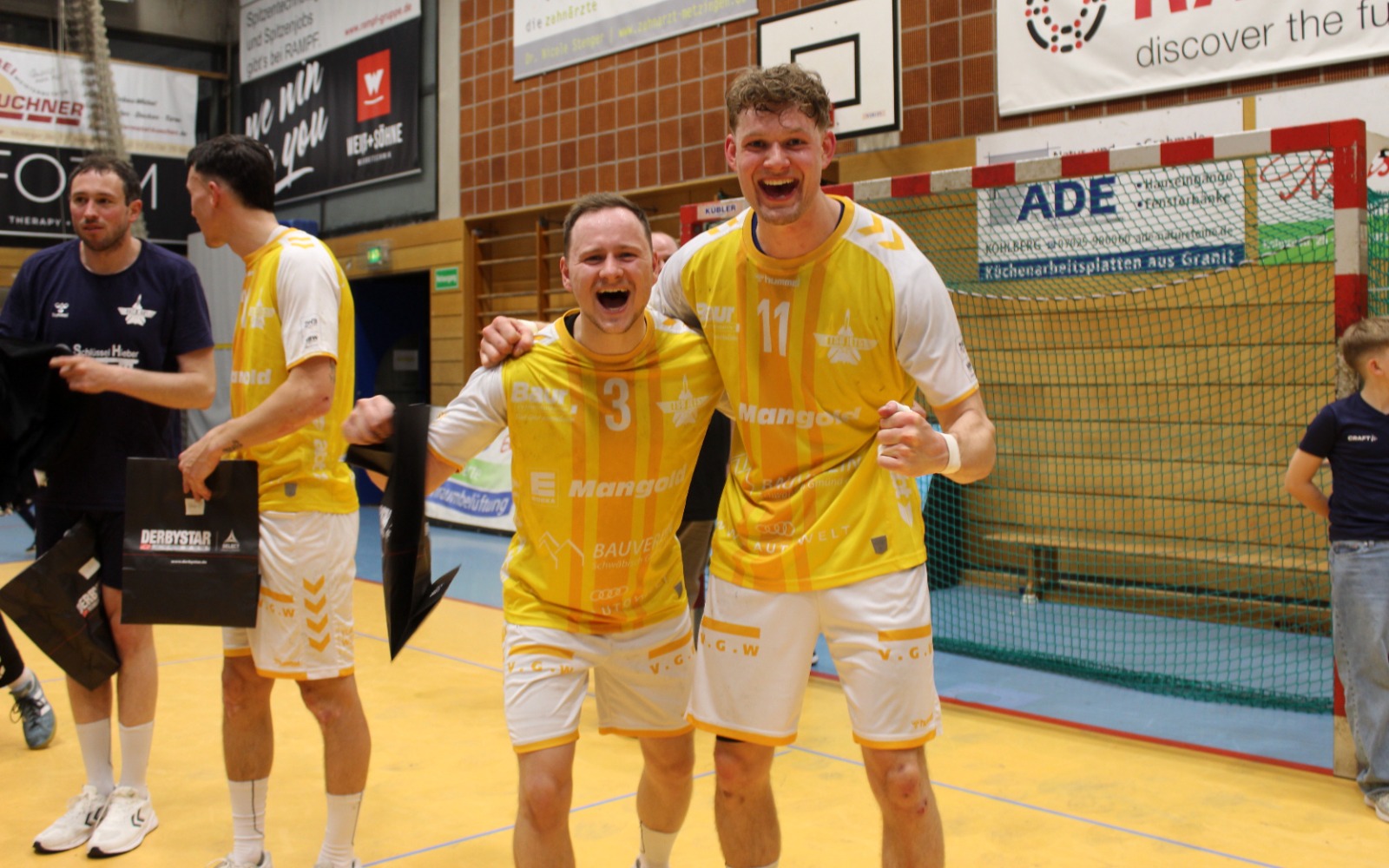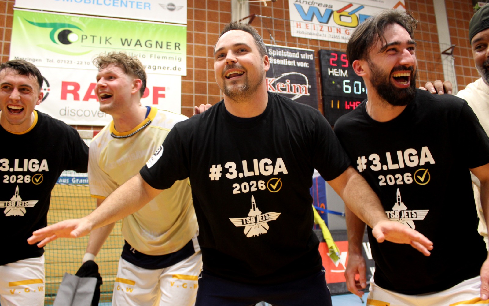 Als Andreas Maier den letzten Ball abblockte und die Zeit herunterlief, da sank Mitspieler Kai Schäffner erschöpft auf die Knie und wurde vom Wolfgang Bächle beinahe erdrückt. Im nächsten Momente stürmten die Jugendspieler des TSB Gmünd, die 60 Minuten lang an den Trommeln den Takt vorgegeben hatten, dazu. Wenig später verpasste sich das Kapitänsduo Bächle und Tom Abt gegenseitig die erste Bierdusche. Die Hofbühlhalle in Neuhausen wurde zum Startpunkt für eine zuvor nie dagewesene Party. Der 18. April 2026 ist ein Tag für die Geschichtsbücher des TSB Gmünd gewesen.